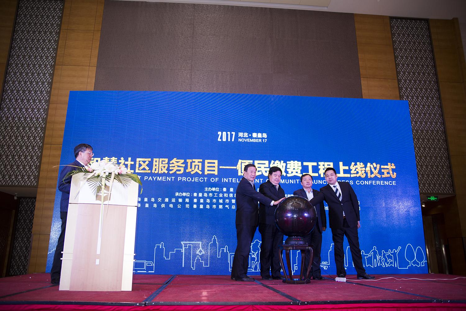 2017年11月17日,秦皇岛智慧社区服务项目·便民缴费工程上线仪式在秦皇岛香格里拉大酒店举行。秦皇岛市委副书记、市长张瑞书,副市长孙国胜,秦皇岛开发区管委会主任苏景文,市政府秘书长吕国新,市政府副秘书长刘尤优,市工信局局长赵柏林,以及各相关单位的领导出席活动。本次活动由市政府秘书长吕国新主持。孙国胜副市长、徐良淑总经理分别代表秦皇岛市政府和河北智融众和公司签署战略合作协议。张瑞书市长、孙国胜副市长、苏景文主任与徐良淑总经理共同触摸启动球,正式启动智慧社区·便民缴费工程。